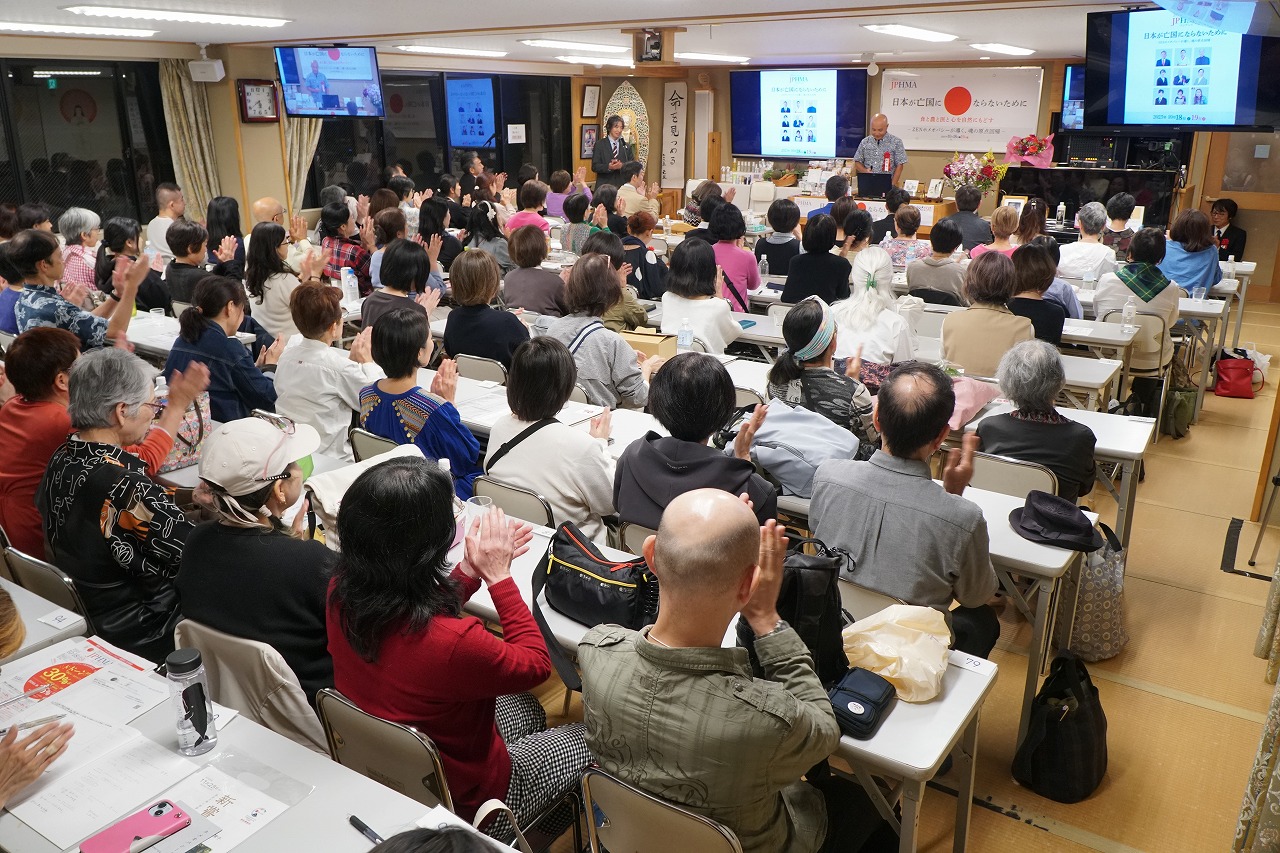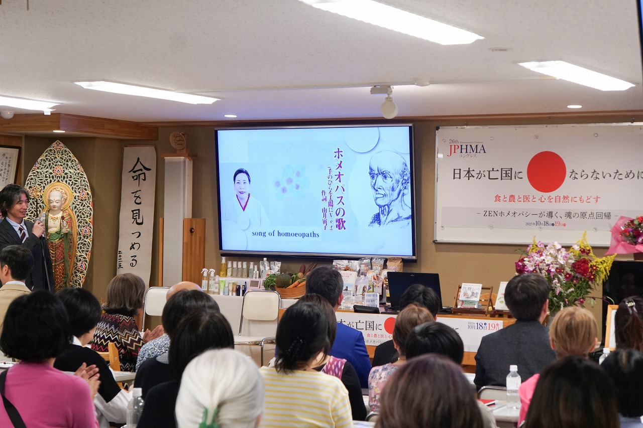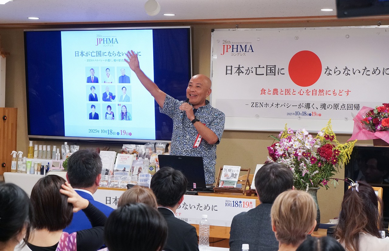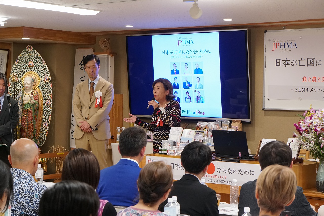 「2日間いかがでしたか?大変な時代が来るということ。今回、様々な強烈なメッセージを聞きました。皆様、たくさんのことを感じたと思います。皆様、感じたら、ちょとした行動でも起こしていきましょう。キットを持つことでもいいですし、ホメオパシーを使ってみるとか、日本を守るために何か支援することでもよいです。感じたことを行動に移していってください。第26回JPHMAコングレスをこれにて 閉会致します。」