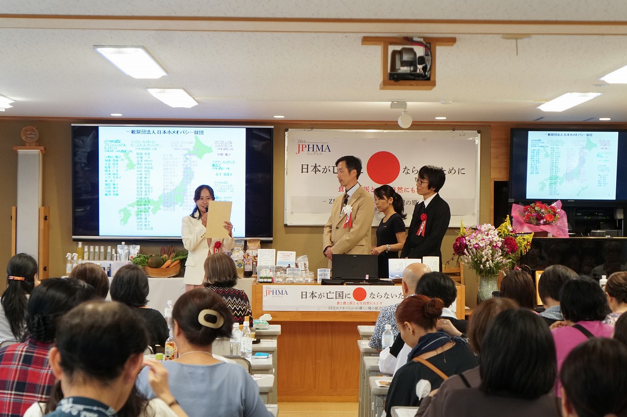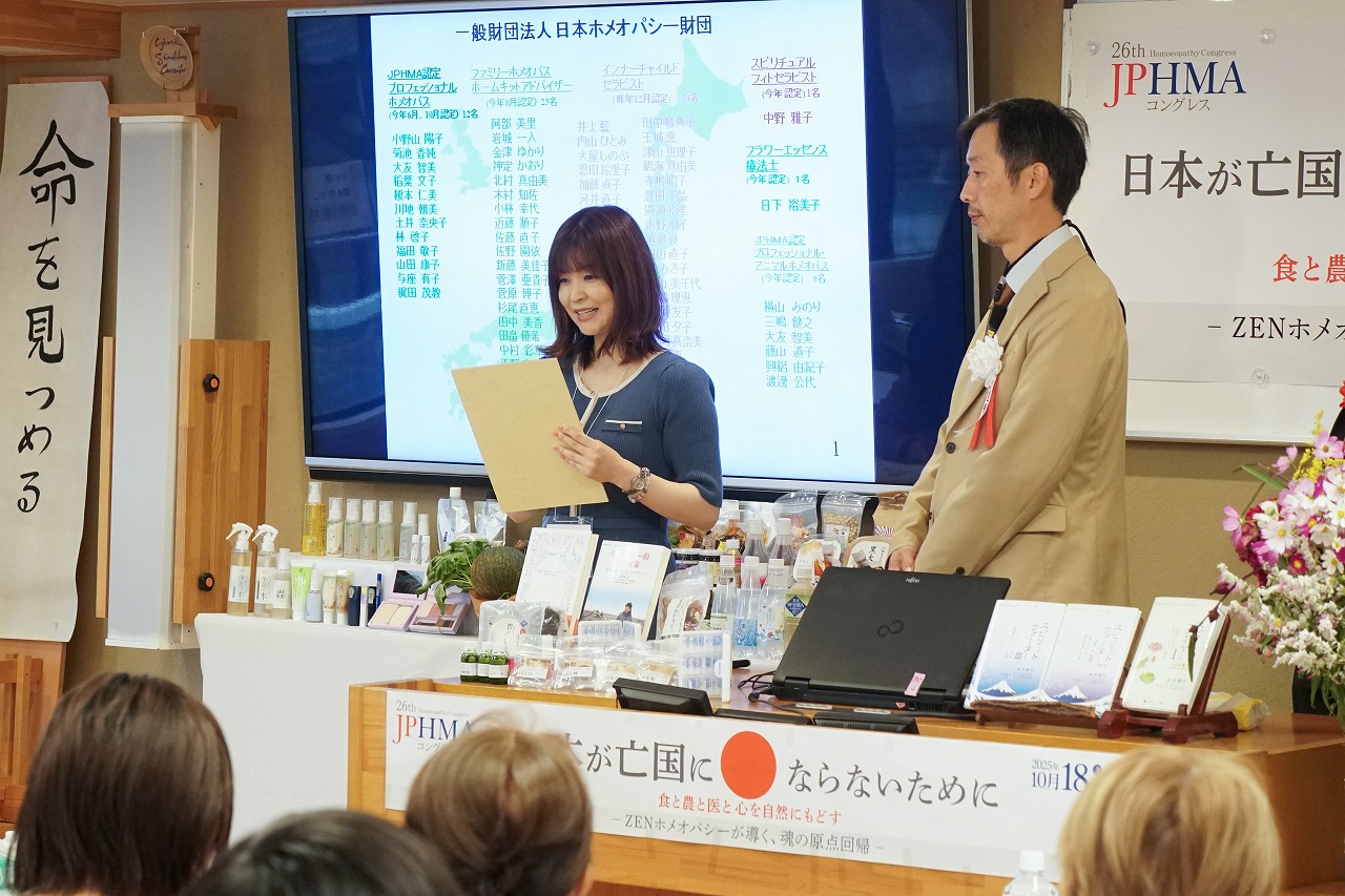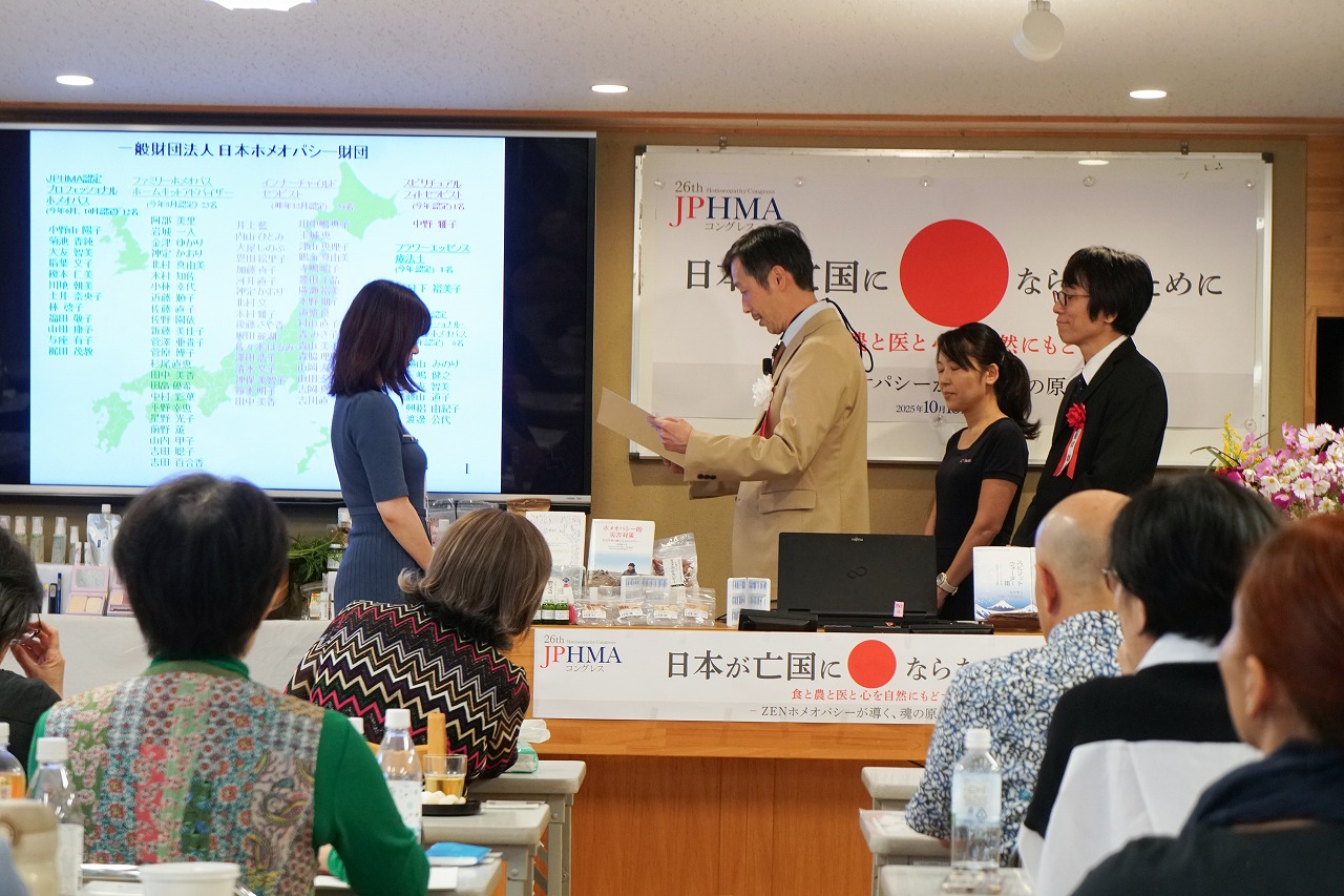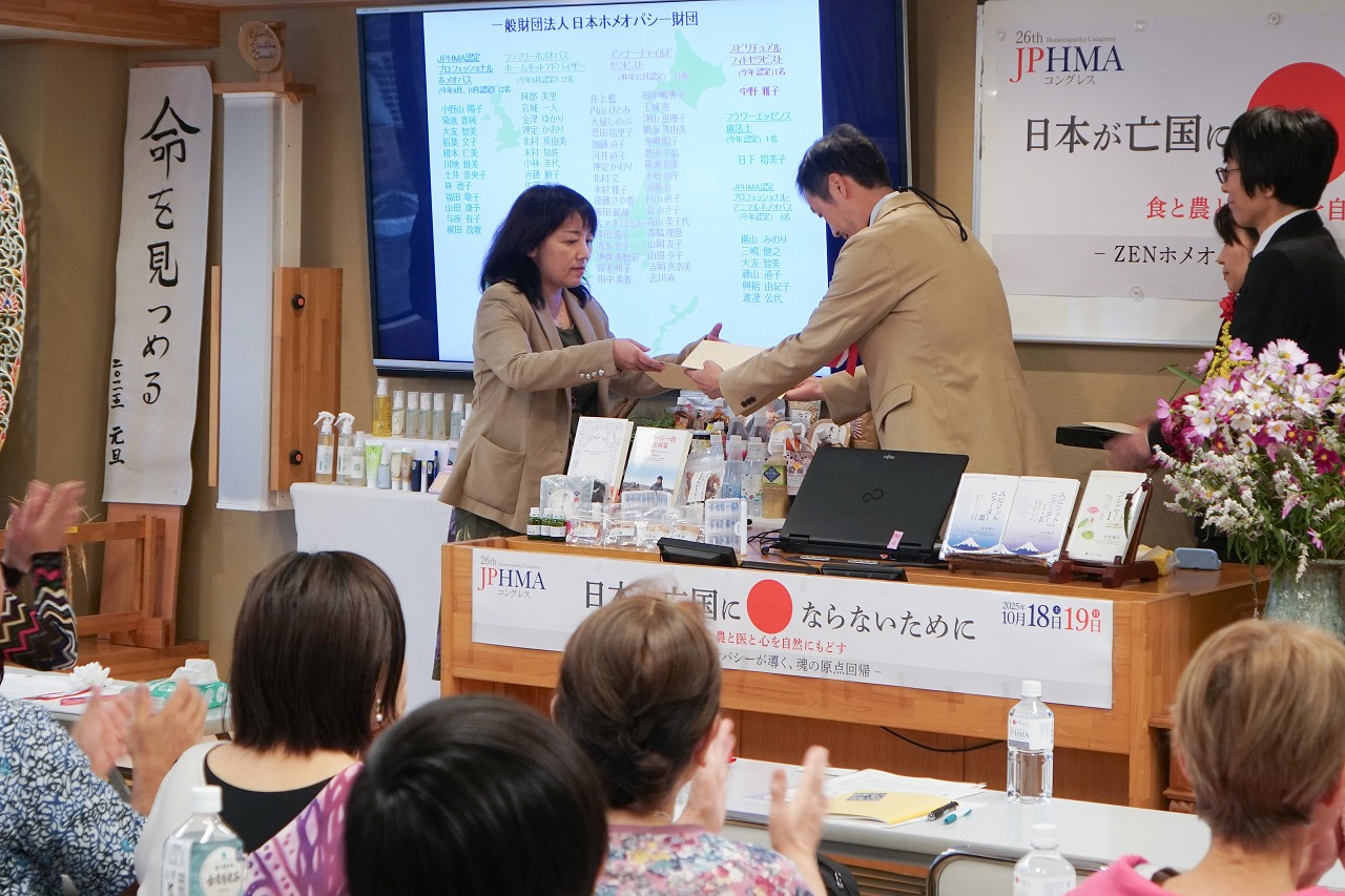 昨年のコングレス以降、新たに認定を受けた、プロフェッショナルホメオパス、ファミリーホメオパス、インナーチャイルドセラピスト、アニマルホメオパス、スピリチュアル・フィトセラピスト、フラワーエッセンス療法士の方々の代表者に由井名誉会長、道繁会長より、各コースの代表の方々に認定証が授与されました。